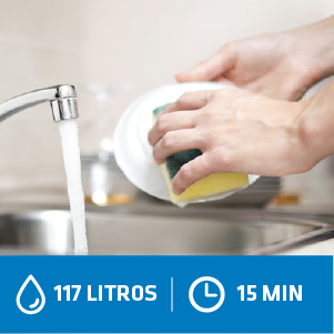 Dica: Se a louça for lavada fechando-se a torneira enquanto se ensaboa, a economia de água é de até 97 litros daqueles 117 litros gastos em média por 15 minutos. Limpe os restos de comida dos pratos e das panelas e jogue-os no lixo. Só abra a torneira para enxaguar a louça.
