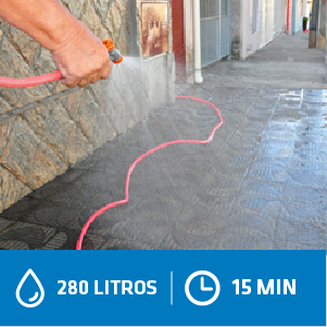 Dica: Lavar calçadas sem utilizar mangueira permite economia de 250 litros. Para poupar água, use balde, se necessário.